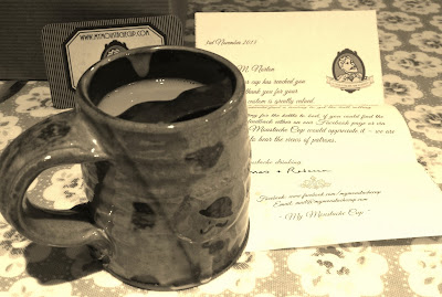 I was first alerted to the existence of said drinking vessel manufacturers on the Twittering Device. Following an appeal for a moustache cup, the lovely Tom from My Moustache Cup dispatched a message in 140 characters or less by way of introduction.