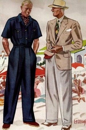Another fine look is a dark short-sleeved shirt, paired with a cravat and wool trousers, with signature pleats.