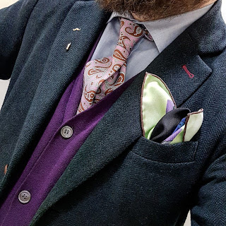 This week, I combined the RHYS tie with the NAVIGATOR III pocket square. This was a fun ensemble, giving me a chance to wear a new purple cardigan from Woolovers.